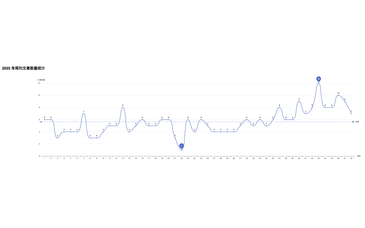 顺手统计了一下周刊里文章的数量,平均在 5.45 篇,基本符合最初的预期。从 33 周开始上升到了 6 篇,应该是找到了节奏和感觉。