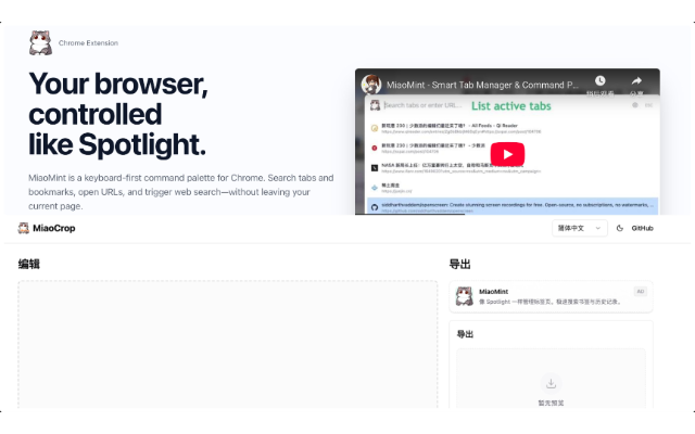 - MiaoMint: 像 Raycast/Spotlight 那样管理标签/书签/历史记录的快速搜索和切换的Chrome 插件。目前还在持续迭代中。