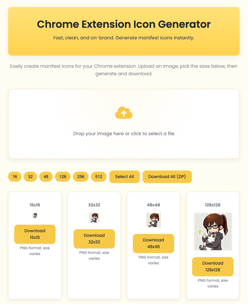 - [3] Chrome Extension Icon Generator | Generate Icons for Your Chrome Extensions Online: https://icon128.com/