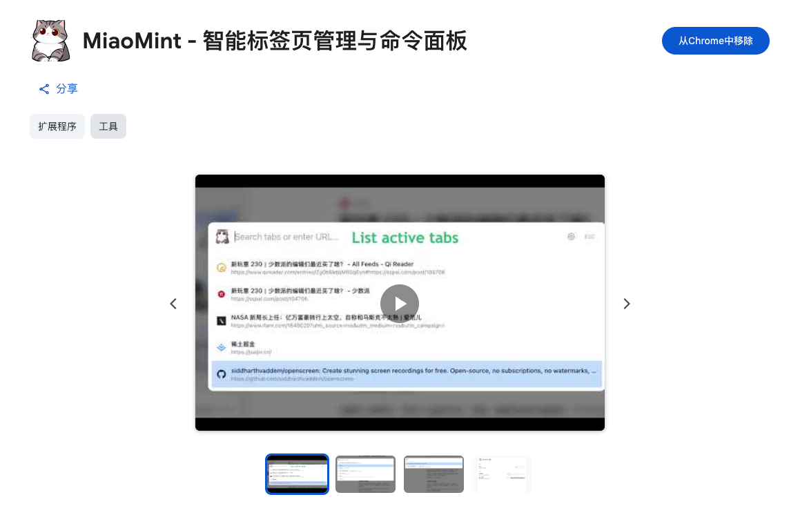 所以这周抽空在 AI 的帮助下做了一个 Chrome 的标签管理插件。现在已经上架到了 Chrome 扩展商店。搜索 “MiaoMint” 就可以找到。(后面有关于软件命名的吐槽文,不知道有没有朋友吐槽文这个命名,哈哈)