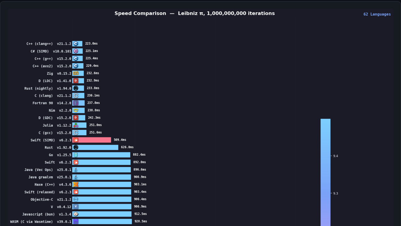 比较了 62 种编程语言的速度。C++ (clang++) 果然还是最快的,Rust (nightly) 排在第 7 位,Go 在 16 位仅次于 Rust(非 nightly) 。JavaScript(Bun)在 24 位,Node.js 在 44 位比 Java 略高 1 位。